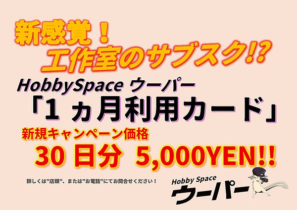 HobbySpaceウーパー 新サブスクサービス 「1ヵ月利用券」を販売開始いたします。 通常料金 1時間600円 延長500円 1日利用先払い3,000円 新サービス 【1ヵ月利用券】 新規キャンペーン価格、30日間5,000円 で販売致します。 有効期限はカード購入日から30日間となります。 期限終了 後は新たなカードを購入して下さい。 「1ヵ月利用券」は購入者のみ有効となります。 必ず入店時にご提示ください。 カード忘れは通常料金でのご案内となります。 他者への貸与、譲渡、売却等は一切禁止です。発覚した場合、当該カードは失効、破棄処分とさせて頂きます。 購入者と偽ってカードを使用しようとした場合は発覚した時点で「1ヵ月利用券」を購入して頂き当日分をご利用頂きます。